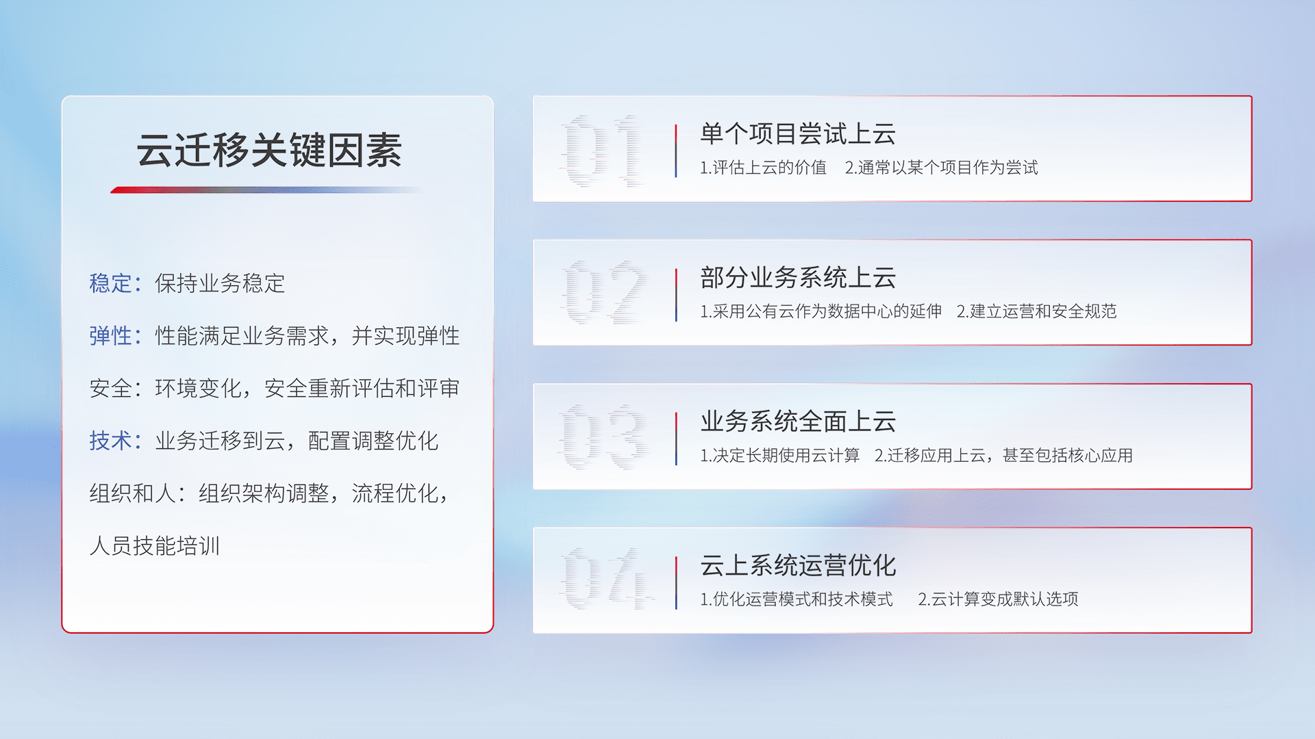 结合实际业务,,,从规划设计、、、、云平台选型、、、云原生改造、、、、数据迁移、、、、集成交付,,,,迁移全过程为客户识别最佳上云路径,,,做好风险识别管理,,,,设计网络架构、、身份权限、、安全审计合规、、操作审计、、、、日志审计、、、、监控告警策略、、、、多站点容灾设计等,,,,对云上基础设施进行整体规划,,提升IT治理水平,,以满足弹性、、、高可用、、、、高性能的需求。。。。