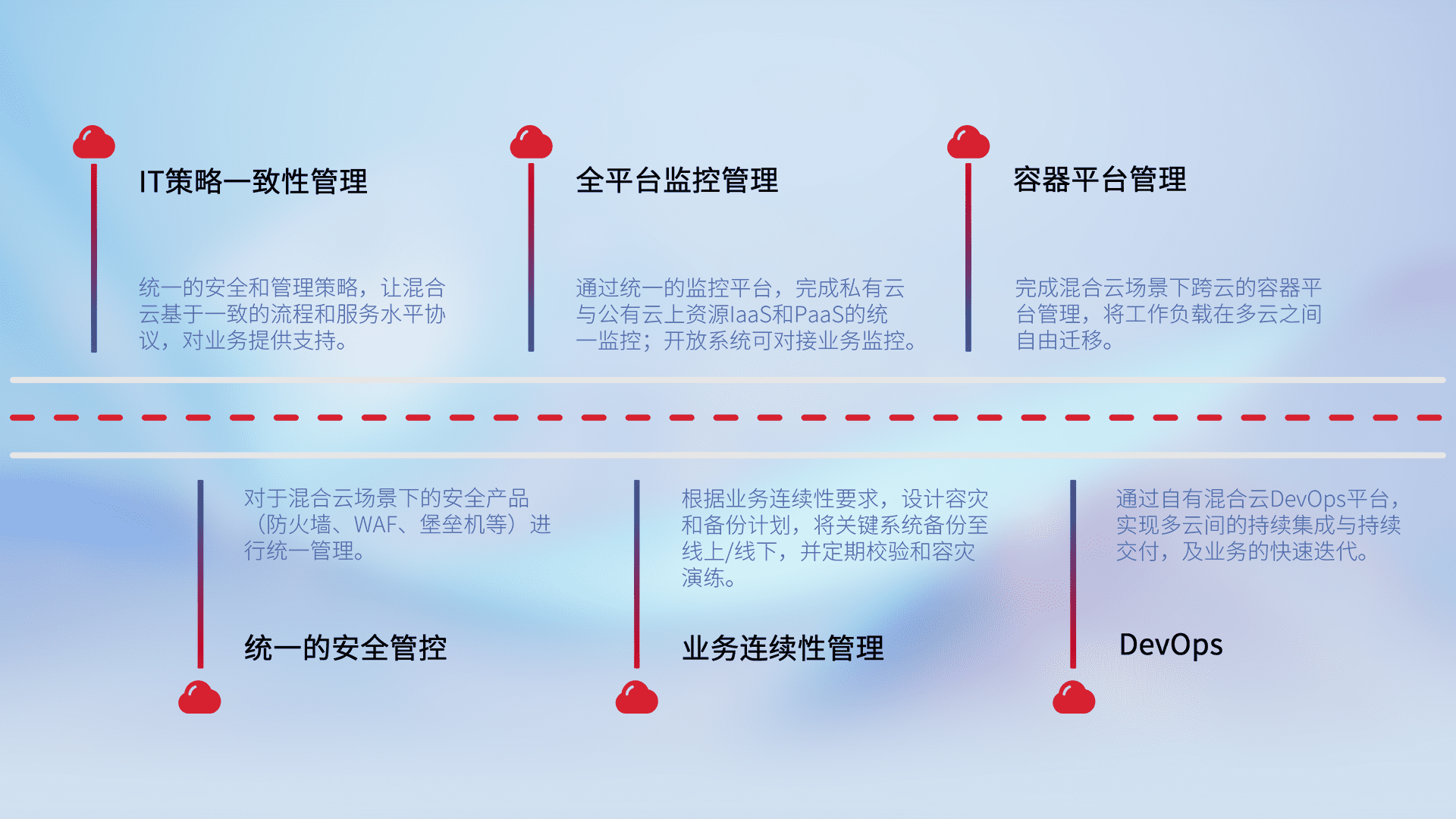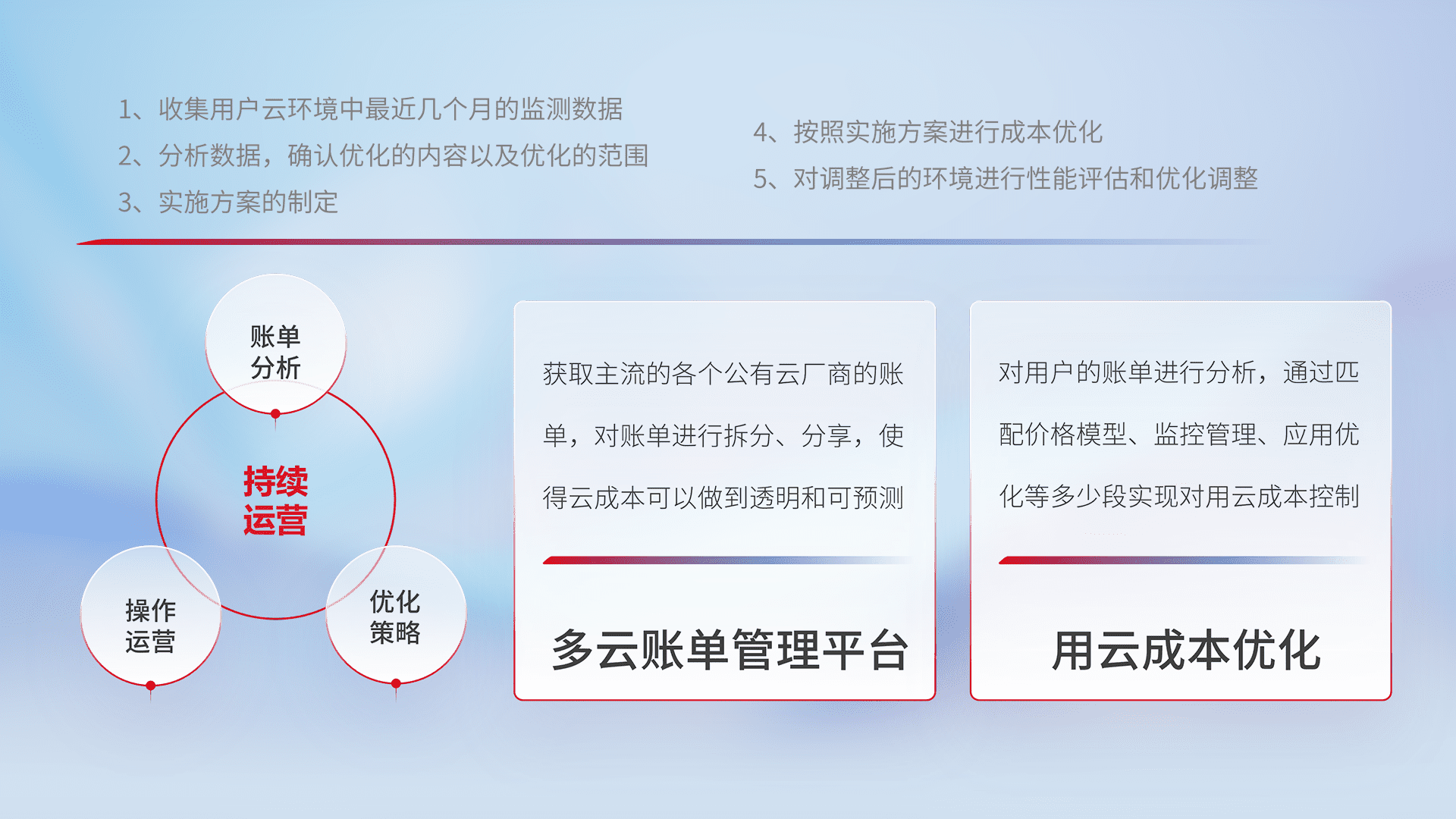 通过多云纳管,,以统一的资源数据模型把客户的云资源进行抽象和封装,,,进而实现对多云资源的统一操作,,,,保障云资源管理的可靠性、、稳定性与可用性。。量身定制化运维内容,,,配置、、、开发运维、、补丁管理、、备份、、、、监控、、、、认证和访问管理、、、、审计和日常巡检等,,保障在用云过程中的可靠度,,,,稳定度以及高可用率。。。。