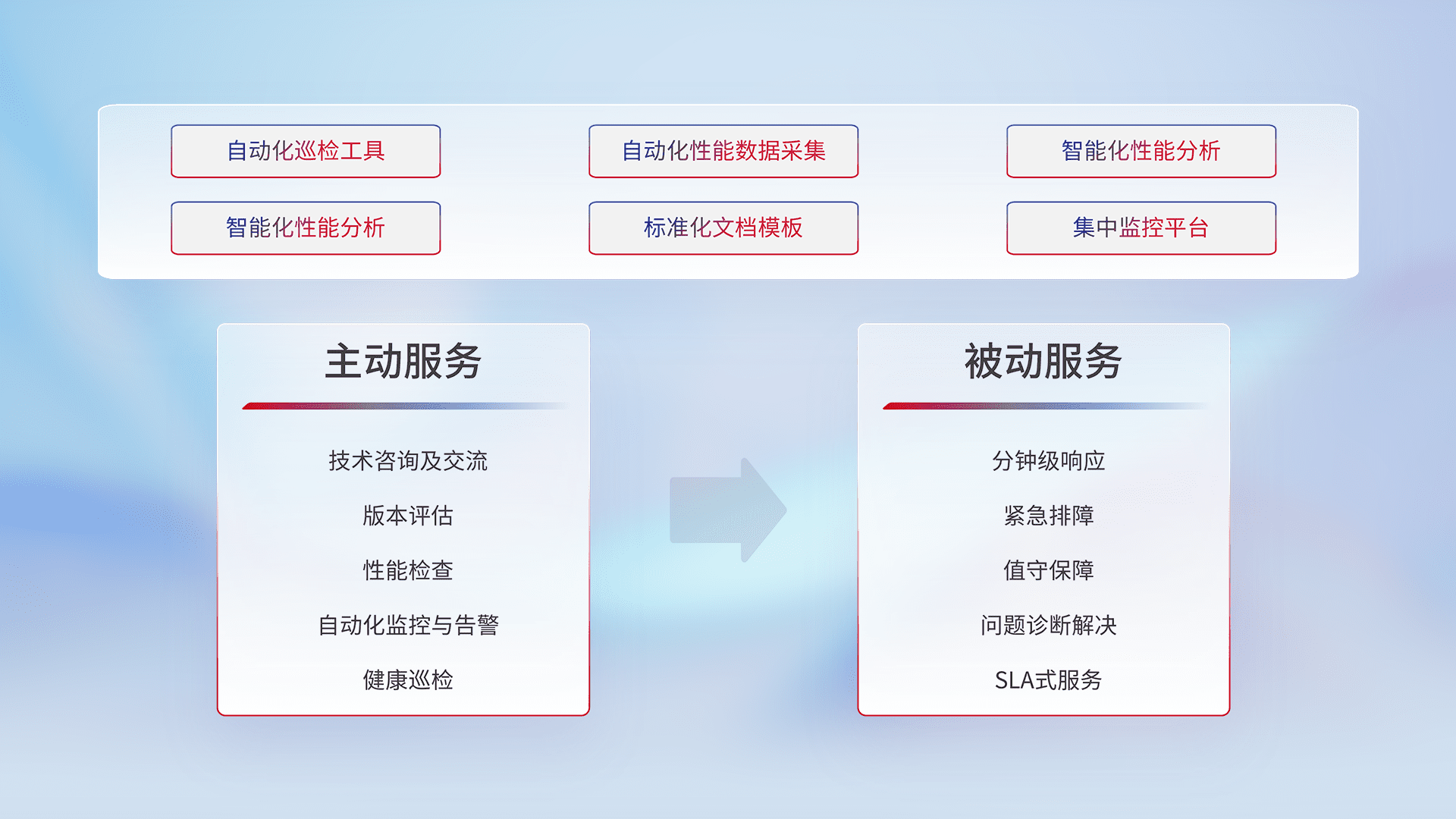 智能化工具和标准化文档,,,保障服务质量,,,提供主动服务(包含技术咨询、、、版本评估、、、性能检查、、自动化监控与告警、、健康巡检)和被动服务包含(分钟级响应、、、、紧急排障、、、、值守保障、、、、问题诊断解决、、、、SLA服务)。。。